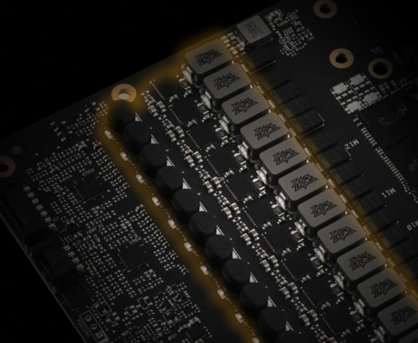 Radiatorul atrage caldura in conducte de caldura care o transporta printr-un teanc de aripioare care umple cea mai mare parte a amprentei mari a cartelei, cu 2.7 sloturi. Aceasta generatie de placi grafice TUF Gaming are, de asemenea, un radiator dedicat pentru VRAM pentru a mentine temperaturile mult sub specificatiile maxime de functionare.