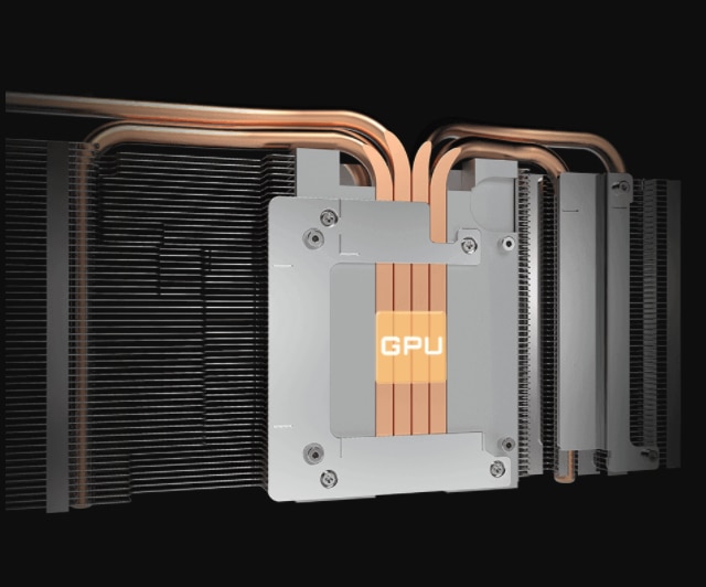 Tuburi termice cu direct touch Forma conductei de caldura din cupru pur maximizeaza zona de contact direct cu GPU. Conducta de caldura acopera, de asemenea, VRAM printr-un contact mare cu placi metalice pentru a asigura o racire adecvata. | ![]() |
