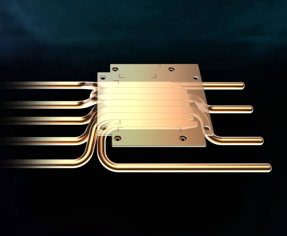 Cu contact direct cu GPU si VRAM, placa mare de cupru combina conductele de caldura compozite pentru a transfera eficient caldura generata de la miezurile interioare la radiator.