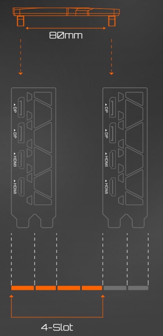 Camera de vapori, conducta de caldura si radiatorul, toate din cupru, au o eficienta termica superioara pentru disiparea rapida a caldurii din GPU. Conducta de caldura extinsa poate ajuta, de asemenea, la indepartarea caldurii de la nuclee. Cadrul din metal negru disipeaza in continuare caldura de la alte componente critice, sporind eficienta generala de racire.